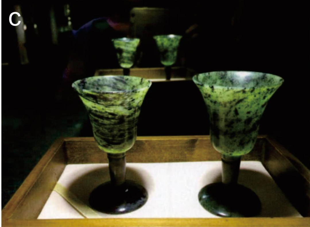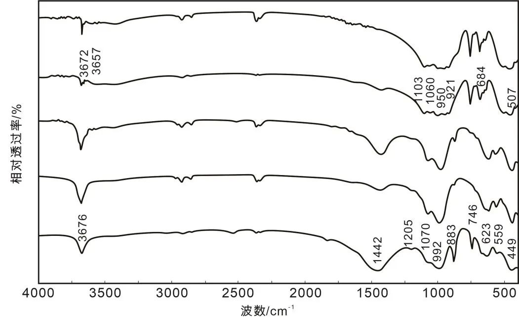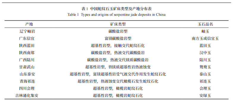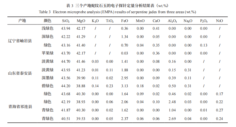 “岫巖玉”為透明度較好的黃綠和綠色,大多為蠟狀光澤;“泰山玉”為透明度較差的深綠色,常伴隨黑、白、褐色斑點(diǎn),有時(shí)可達(dá)玻璃光澤;“祁連玉”也是透明度較差的深綠色且顏色分布不均勻,局部可見(jiàn)絲絹光澤。因此,肉眼觀察三個(gè)產(chǎn)地蛇紋石玉的顏色、光澤等寶石學(xué)外觀特征后可嘗試初步判斷產(chǎn)地。