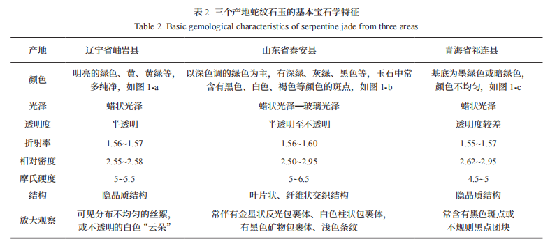 “岫巖玉”大多具有白色的絲狀、團(tuán)狀包裹體;“泰山玉”具有金色反光的、白色、黑色包裹體和淺色條紋;“祁連玉”具有黑色斑點(diǎn)或不規(guī)則黑點(diǎn)團(tuán)塊。因此基本寶石學(xué)數(shù)據(jù)和顯微觀察可以輔助判斷產(chǎn)地。三個(gè)產(chǎn)地蛇紋石玉的基本寶石學(xué)特征總結(jié)如表2所示: